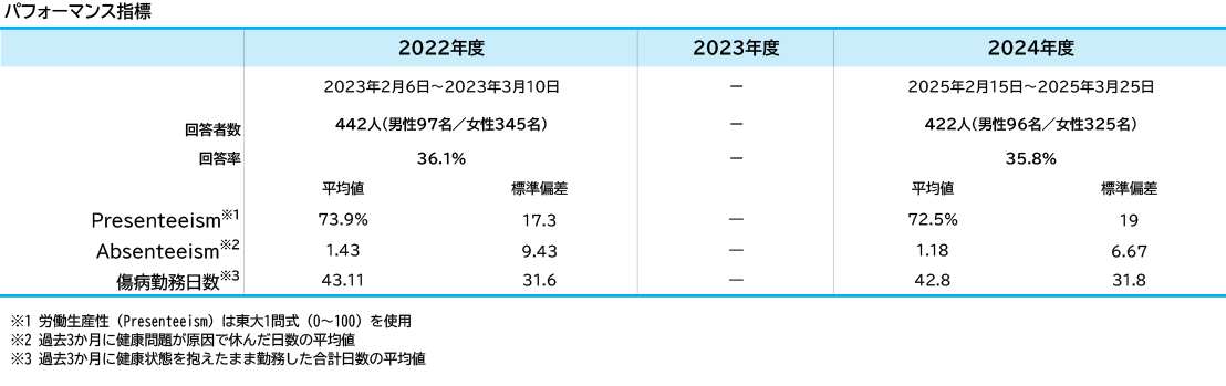 健康的な職場づくりに向けて、全職員対象にエンゲージメント・パフォーマンス調査を実施しました。調査期間は2025年2月15日から2025年3月25日で、422人(回答率:35.8%)から回答を得ました。 (調査に使用した尺度については、注釈参照)